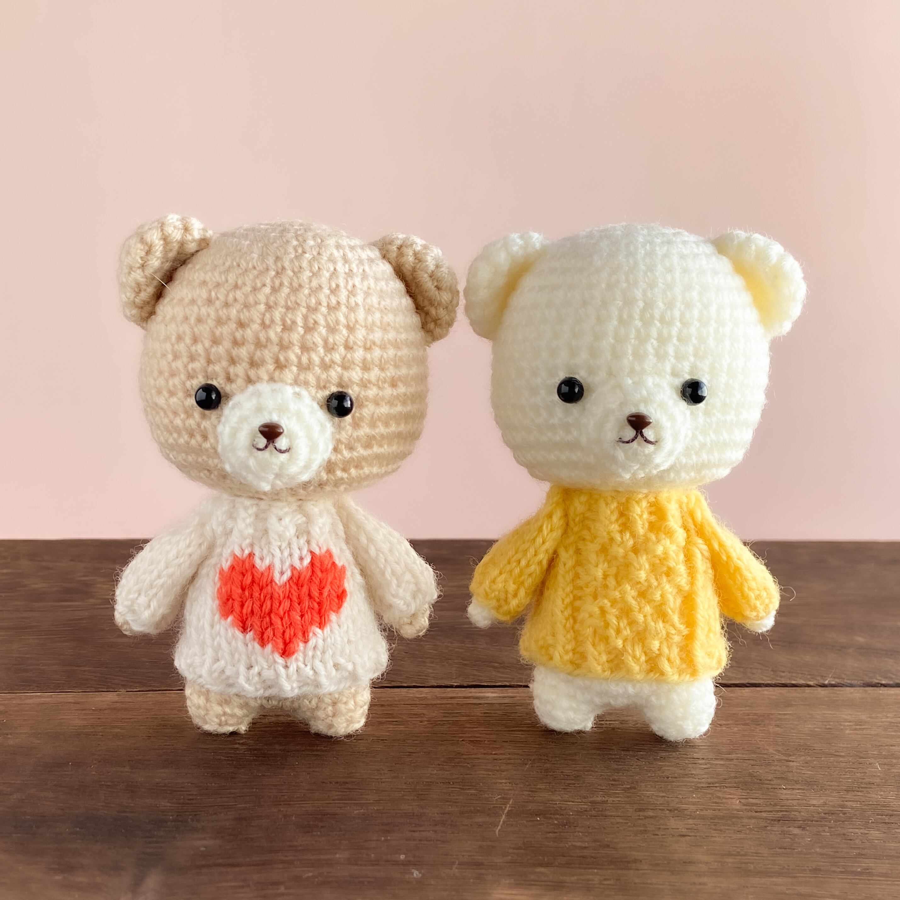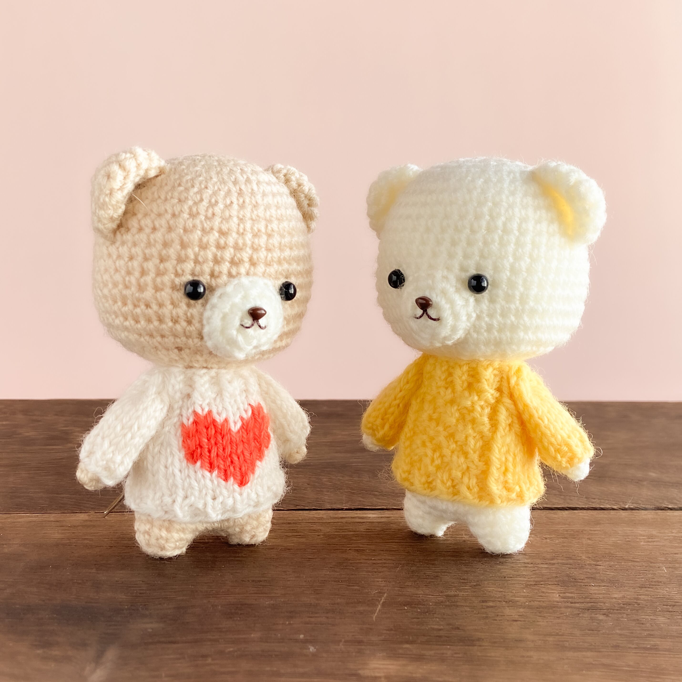 あったかくてやさしい手触りのウール毛糸で、ハートの編み込み風セーターと部分かのこ編みのセーターを着せてあげました。